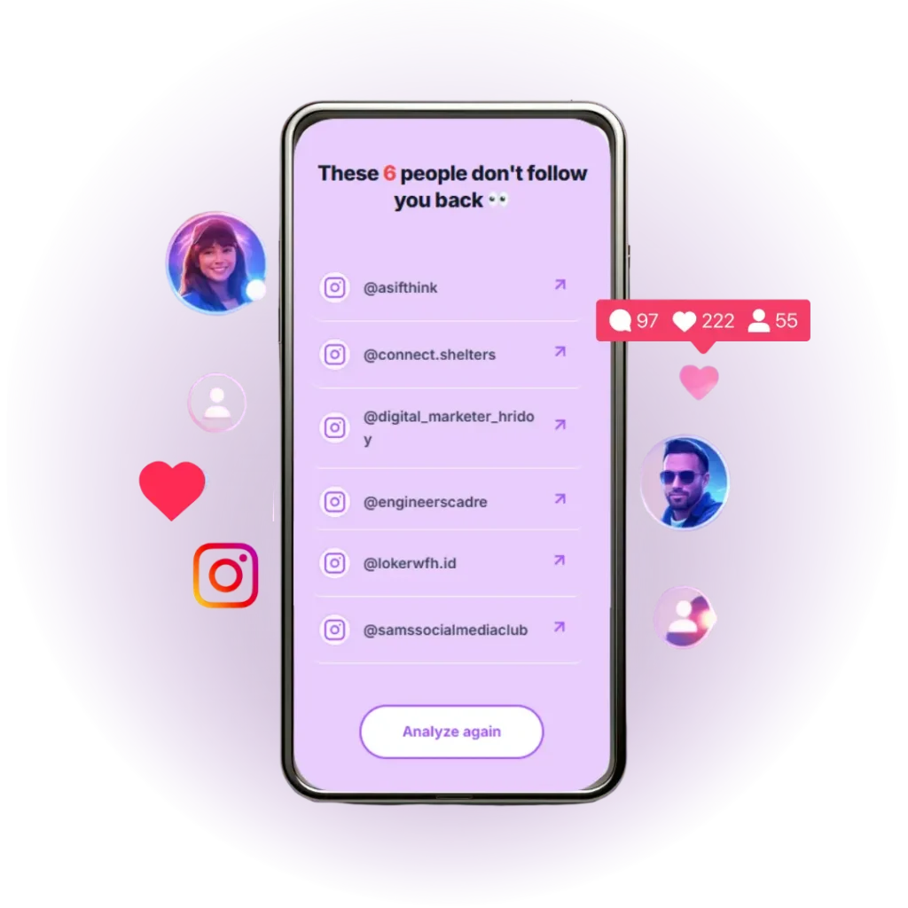 our specially designed to find inactive users and help you to build a stronger social media presence. Instead of analyzing manually, we can compare your account’s followers and followings to find out unfollowers. This is how to improve your account growth by 50%. Unfollowers tracker helps you to understand your Instagram audience better.